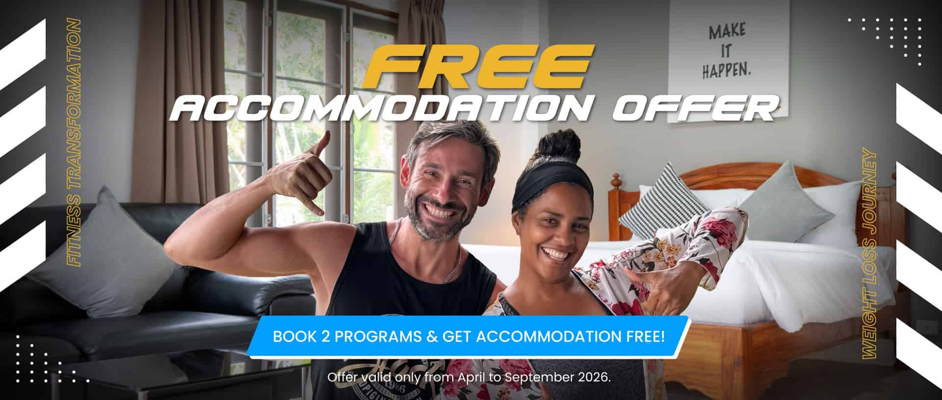 Sign up for two full programs and your accommodation is completely free. That means both of you can recharge, reset, and crush your goals—without sharing a bed or your post-workout snacks.